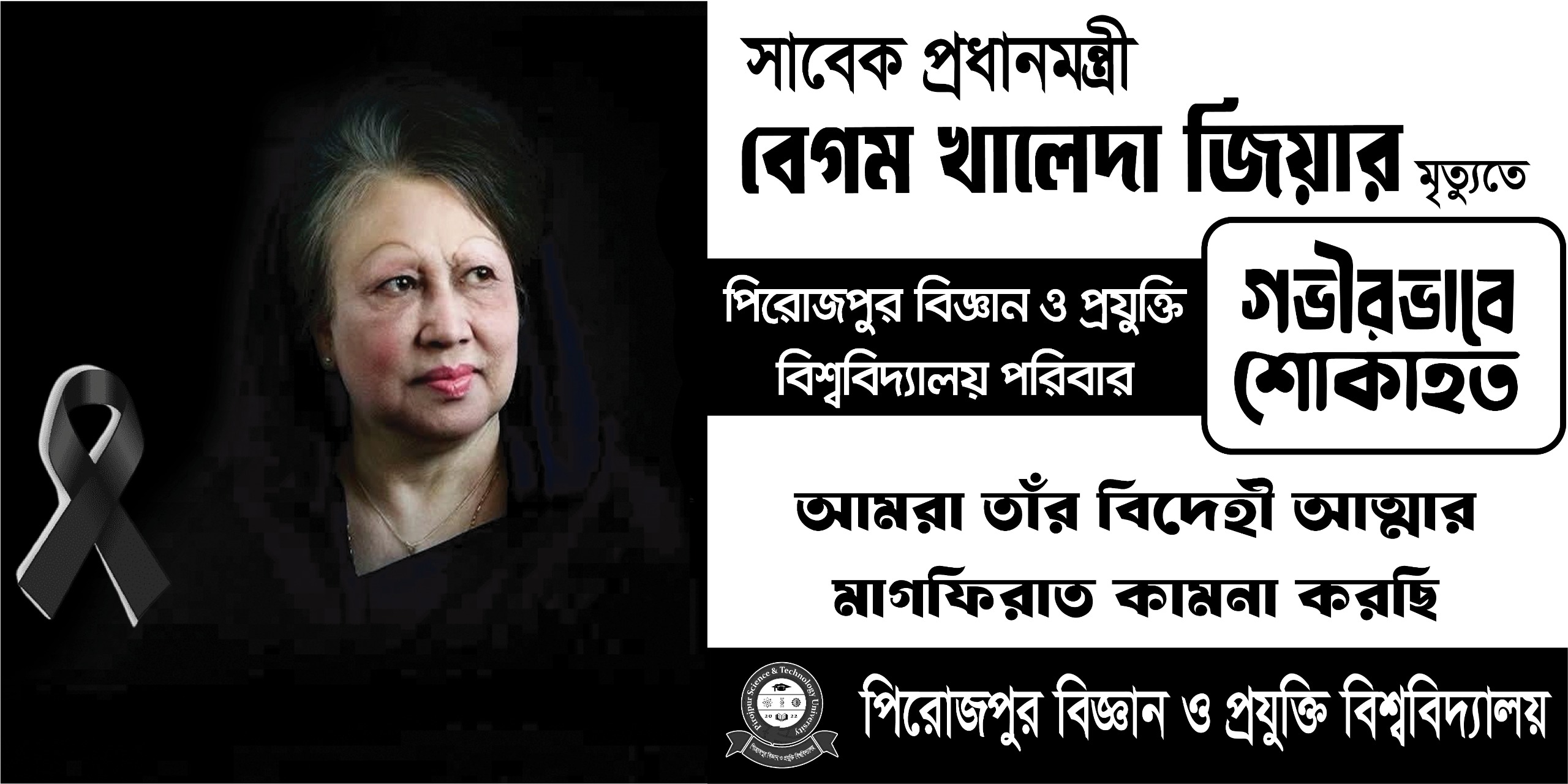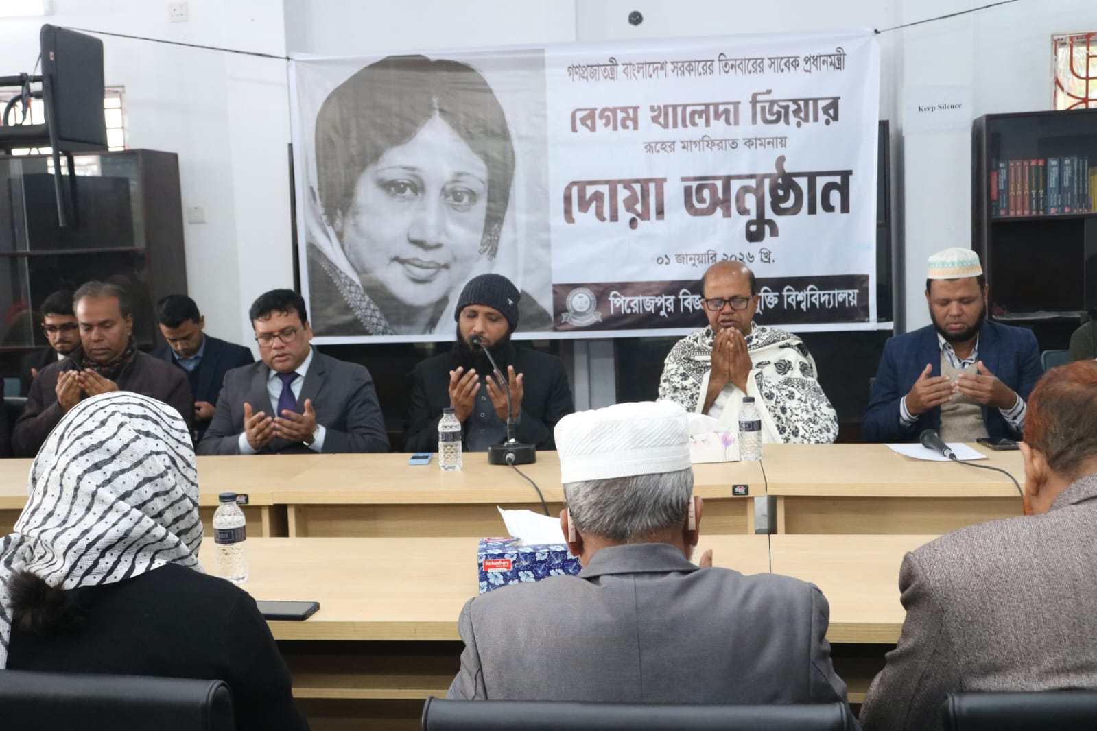 সদ্যপ্রয়াত সাবেক প্রধানমন্ত্রী বেগম খালেদা জিয়ার আত্মার মাগফিরাত কামনা করে পিরোজপুর বিজ্ঞান ও প্রযুক্তি বিশ্ববিদ্যালয়ে অদ্য ১ জানুয়ারি ২০২৬ খ্রি. বৃহস্পতিবার সকাল ১১:০০ টায় দোয়া ও মোনাজাতের আয়োজন করা হয়েছে। একাডেমিক ভবনে অবস